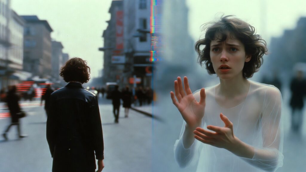 Derealizacja to stan, w którym otaczający świat wydaje się nierealny, odległy, sztuczny lub jakby oglądany przez mgłę/film/szybę. Kolory mogą być przytłumione, dźwięki stłumione, a wszystko „jak we śnie”.